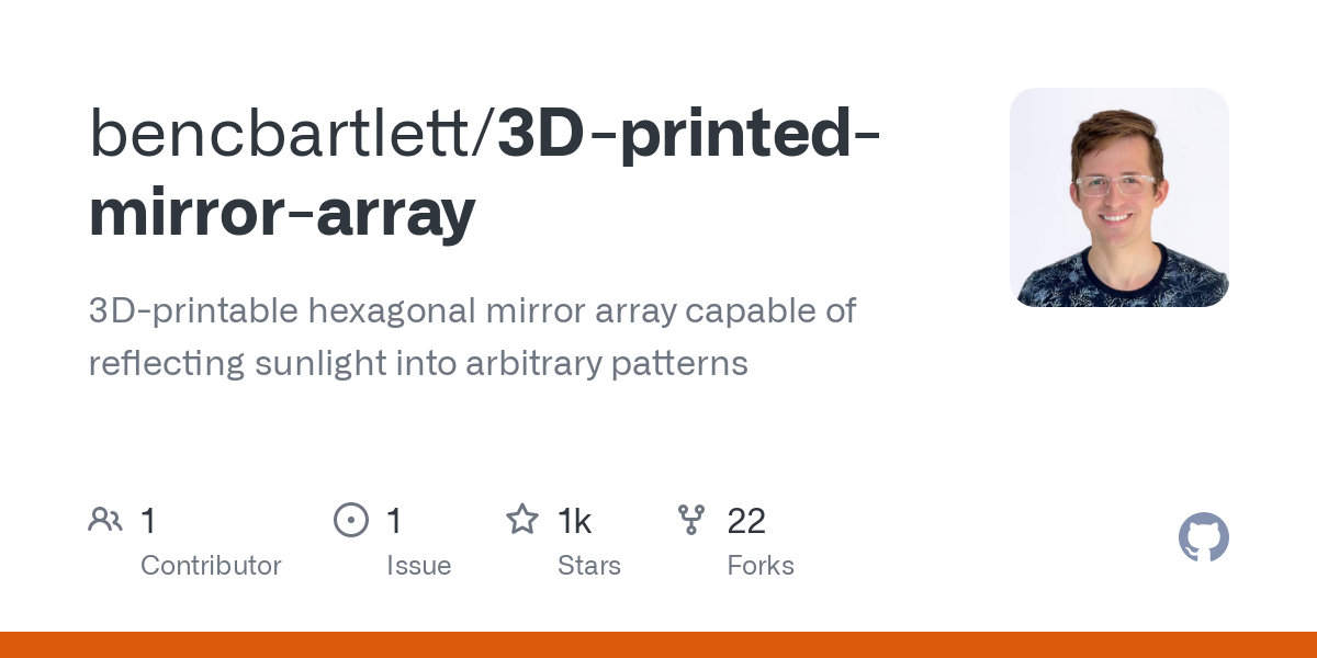 GitHub - bencbartlett/3D-printed-mirror-array: 3D-printable hexagonal mirror array capable of reflecting sunlight into arbitrary patterns