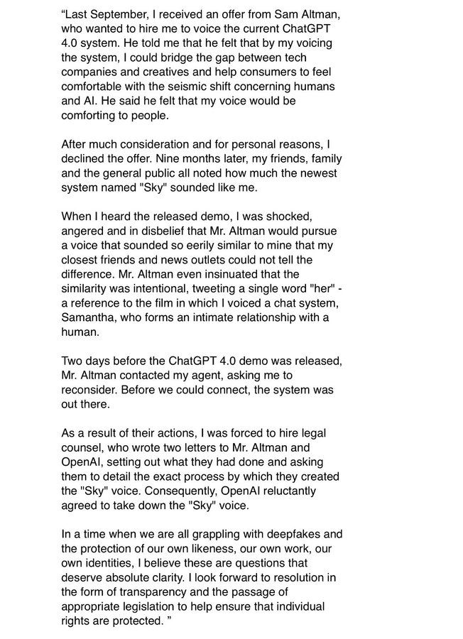 Bobby Allyn on X: "Statement from Scarlett Johansson on the OpenAI situation. Wow: https://t.co/8ibMeLfqP8" / X