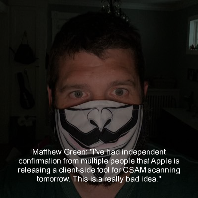 I’ve had independent confirmation from multiple people that Apple is releasing a client-side tool for CSAM scanning tomorrow. This is a really bad idea.
