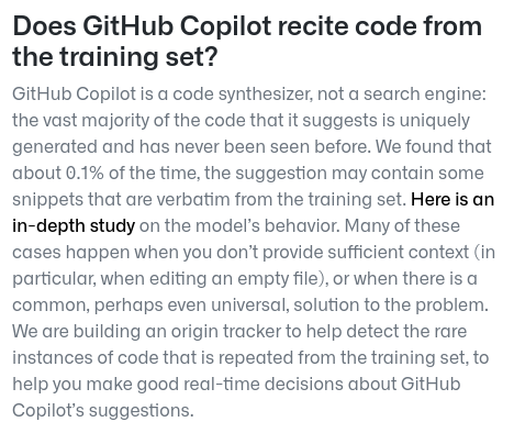 github copilot has, by their own admission, been trained on mountains of gpl code, so i'm unclear on how it's not a form of laundering open source code into commercial works. the handwave of "it usually doesn't reproduce exact chunks" is not very satisfying https://t.co/IzqtK2kGGo