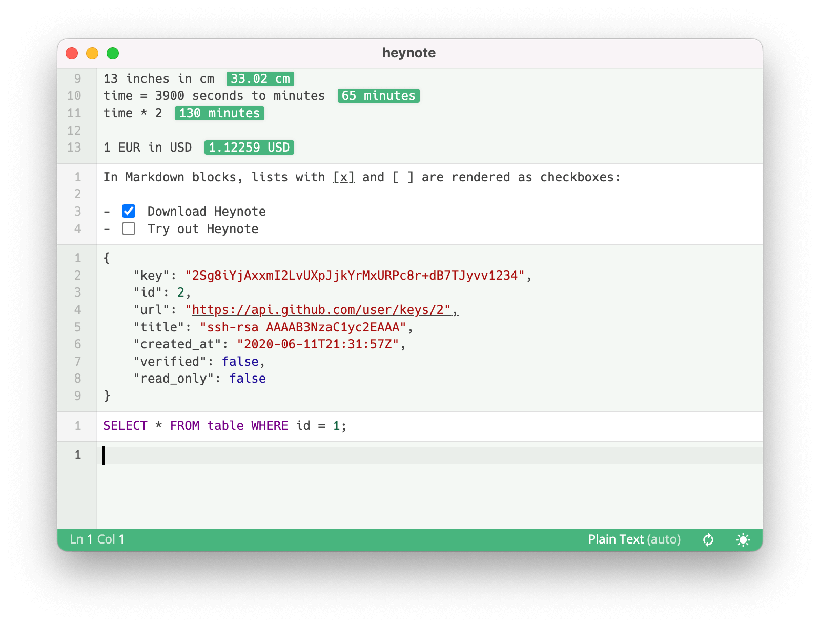 One buffer, many blocks At its core, Heynote is a large, persistent text buffer divided into blocks. Creating a new block is as easy as pressing ⌘-Enter, and pressing ⌘-A within a block selects the c